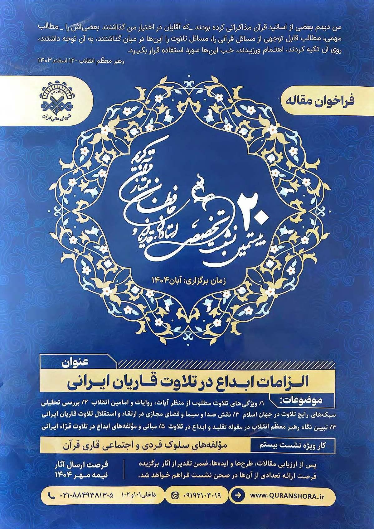 بیستمین نشست علمی- تخصصی استادان، قاریان و حافظان ممتاز قرآن کریم با عنوان "الزامات ابداع در تلاوت قاریان ایرانی" از سوی شورای عالی قرآن و با هدف ارتقاءسطح دانشی و مهارتی جامعه قاریان در آبـان مـاه 1404 برگزار خواهـد شـد.