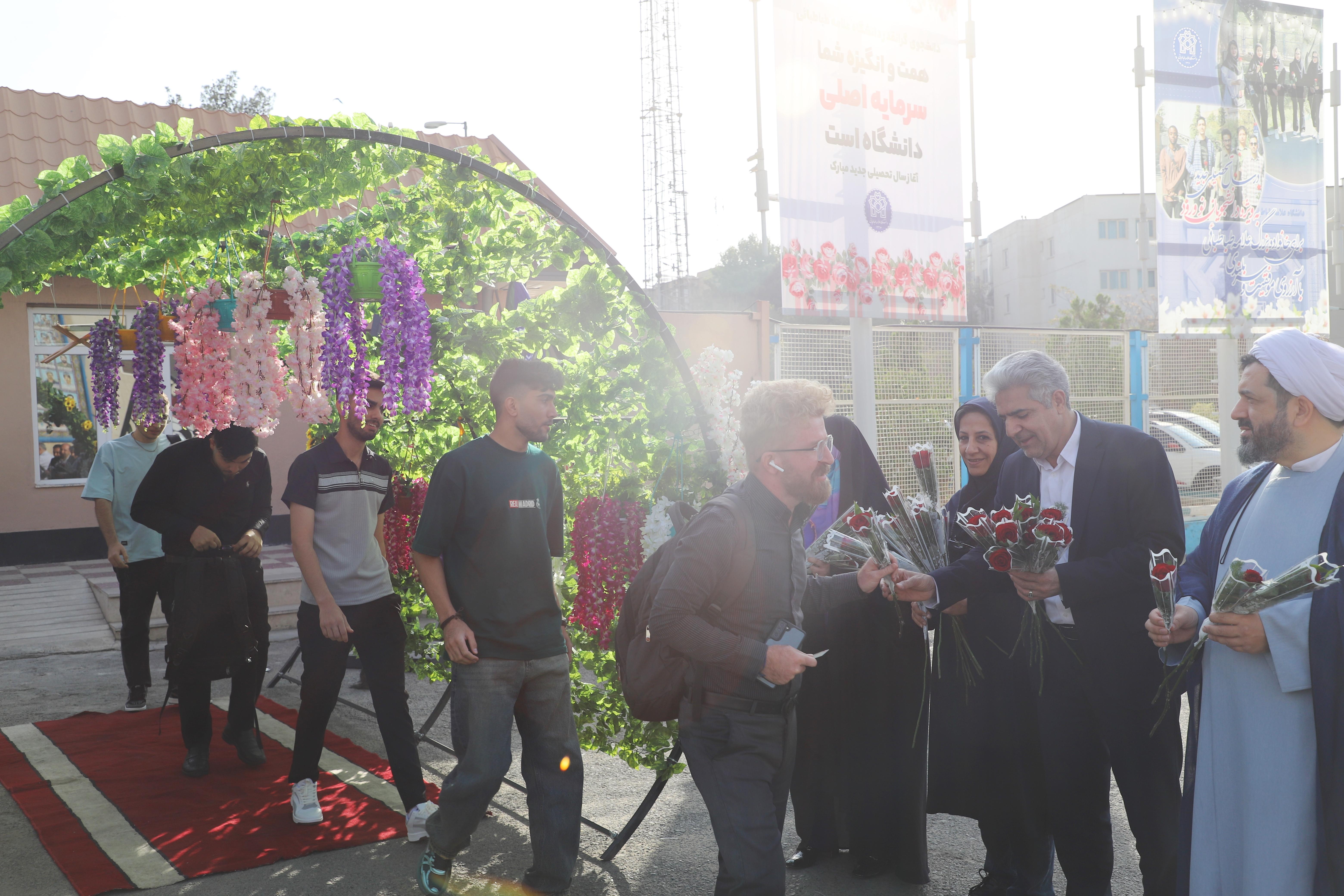 در ادامه، مسئولین دانشگاه با اهدای گل به دانشجویان، آغاز سال تحصیلی را به آنان تبریک گفتند و با این اقدام، فضایی گرم و صمیمی برای خوشامدگویی به دانشجویان فراهم کردند که به ایجاد شور و نشاط در جمع دانشجویان کمک کرد.