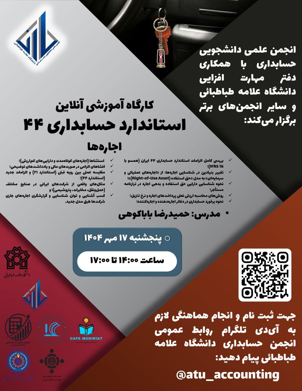 کارگاه آموزشی آنلاین استاندارد حسابداری ۴۴ اجارهها، پنجشنبه ۱۷ مهر ۱۴۰۴ توسط انجمن علمی دانشجویی حسابداری با همکاری دفتر مهارت افزایی دانشگاه علامه طباطبائی و سایر انجمنهای برتر برگزار میشود.